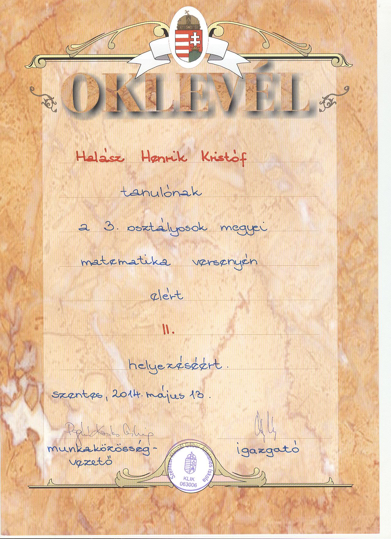 | Matematika Verseny | megyei | II. oklevél |